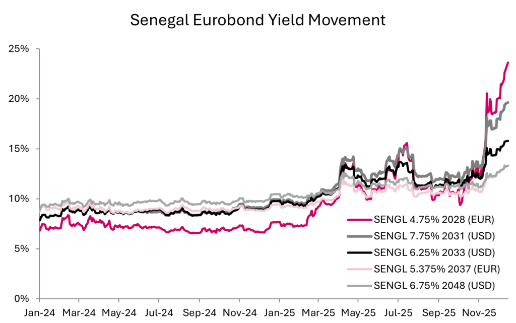 Senegal remains a divisive subject amongst stakeholders who are torn as to whether the Internation Monetary Fund will deem the nation’s debt, estimated to be over 130% of GDP as at the end of 2024, sustainable as part of consultations for a new three-year funded programme. The absence of a staff level agreement at the end of the Fund’s November visit to Senegal and the comments by Prime Minister Sonko means that a new IMF programme may still be some distance away with the Senegalese authorities utilising its alternative, albeit reducing, financing options to manage its financing needs. In a scenario that the Fund determines that the nation’s debt sustainable on a forward looking basis and a new programme is approved by the board, the fiscal consolidation efforts required could be challenging for the Faye-Sonko administration, who thus far have done very little to rein in the fiscal deficit, which was above 12% in 2024, as well as the significant risk of social unrest as subsidies will likely be reduced, new taxes introduced and tax rates increased. As such, the government performance would fall below expectations leading to hard restructuring in 2H 2026, which does not yet appear to be fully priced into outstanding Eurobond prices. As such, we hold a negative view on the bonds with the only catalyst on the horizon being a new funded IMF programme, which still appears to be some time away. Unlike Ghana, Senegal’s pegged currency will limit its ability to inflate away some of the pains, resulting in a very challenging few years for the country, which will be evident in growth and aggregate demand.