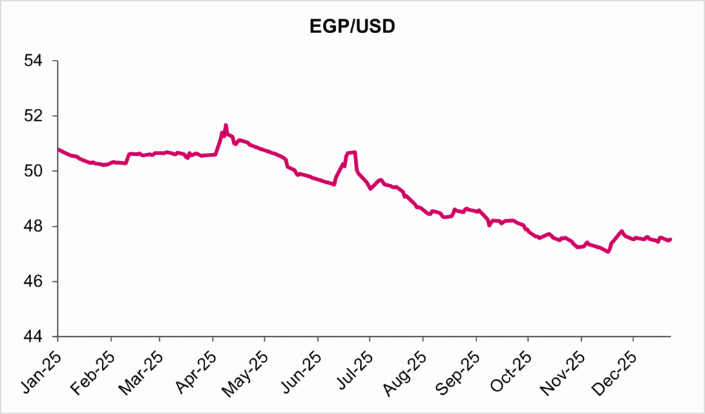 Inflation fell sharply through 2025, reaching a low of 11.7% in September before ticking up to 12.3% in November on administered price adjustments. While inflation is likely to remain above the CBE’s 7% ±2% target band through much of 2026, the broader disinflationary trend remains intact, with further moderation expected in the second half of the year. This has already given the Central Bank of Egypt room to ease decisively, cutting rates by 625bps in 2025. Further gradual cuts are likely in 2026 as policymakers balance supporting growth with maintaining positive real rates.