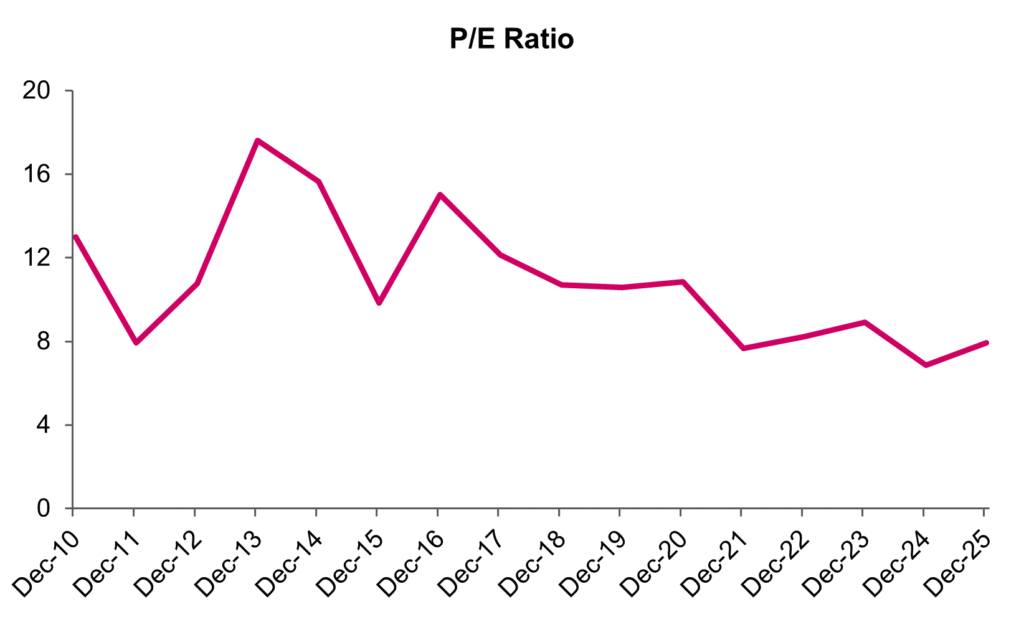 Egyptian equities are trading on a forward P/E of around 7.9x, materially below their 15-year average of 10.9x. That discount is hard to justify in an environment where FX has stabilised, earnings visibility is improving, and the cost of capital is falling.
