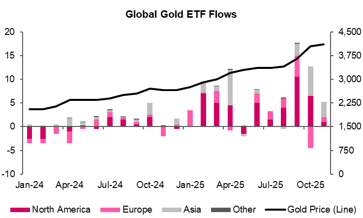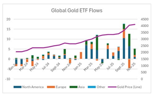 The Chinese government’s announcement of a new VAT reform on gold jewelry, effective from 1 November 2025 through to at least 31 December 2027, has materially altered the economics of traditional retail gold ownership. While gold traded directly on the Shanghai Gold Exchange (SGE) remains VAT-free at the first tier, the treatment of physical withdrawals has become more punitive for non-investment uses. As a result, demand migrated decisively from jewelry toward gold ETFs. In November, total Asian gold ETF inflows reached $3 billion, with China alone accounting for roughly $2 billion. To put that in context, average monthly gold ETF inflows from Asia were approximately $400 million in 2024. By 2025, that average had already risen to around $2 billion per month. November’s Chinese flows alone were five times the entire Asian monthly average in 2024 and effectively matched the whole of Asia’s average monthly demand in 2025.
