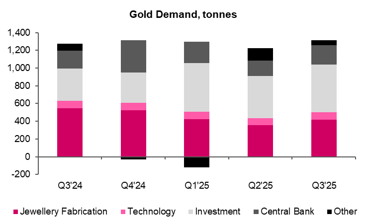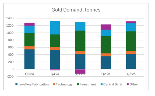 Gold demand rests on four pillars: jewelry, investment, central banks, and technology. Jewelry remains the largest by volume but is highly price sensitive; investment demand is cyclical and reacts fastest to macro shifts; central bank buying is slow-moving but structurally important; and technology demand provides a steady, though smaller, industrial base. As prices rose, the market quietly transitioned from being jewelry-led to investment-led increasingly becoming the driver of the market.