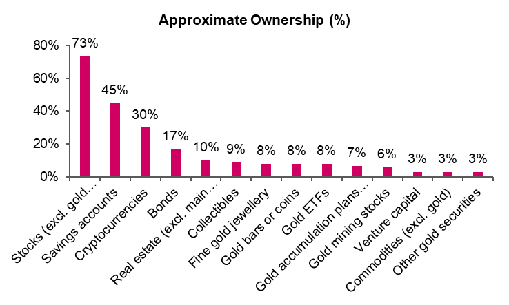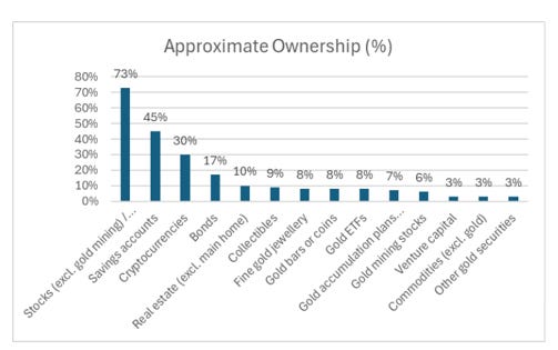 That history is clearly visible in portfolio data today. Gold remains marginal in Japanese portfolios, typically accounting for between 1% and 10% of allocations with the majority clustered at the lower end of that range and very few investors holding more than 20%.