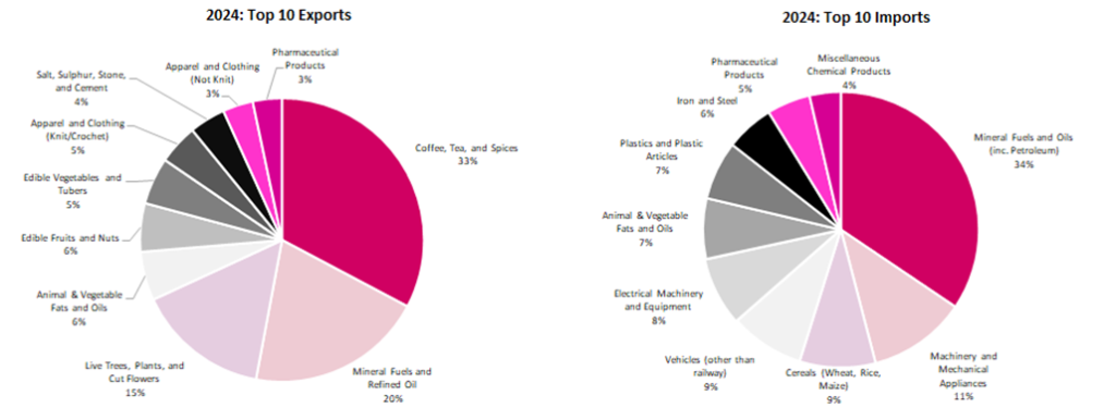 - Higher fertiliser, freight, and insurance costs – Agriculture (20% of GDP and 50–55% of total exports) is negatively impacted by the surge in fertiliser costs, with Urea and Ammonia prices rising by roughly 50% and 25% respectively. Kenya’s flower industry is reportedly losing up to USD 1.4mn per week due to shipment delays and higher freight costs. Additionally, demand for exports may decline as consumer spending weakens in key markets, whilst reduced spending power abroad may also affect remittances.