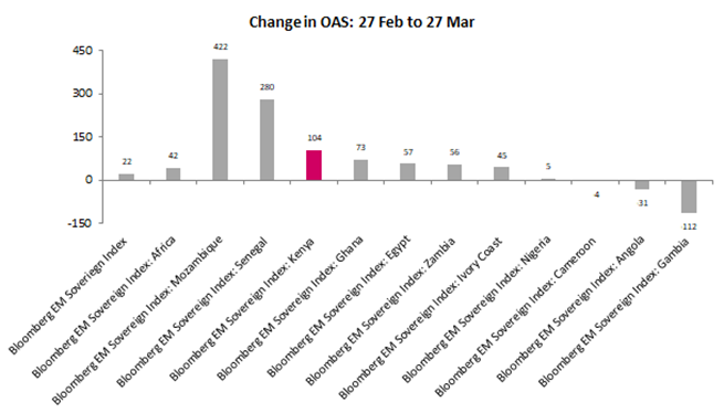 The fallout from the conflict in the Middle East risks materially weakening structural reform efforts by the Kenyan government over the last two years. Eurobond spreads have reacted and Kenya’s Eurobond yields have increased by 104 bps since the start of the conflict—more than the broad EM index and Egypt, and only lower than Senegal and Mozambique.