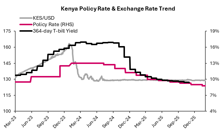 The next MPC meeting is pencilled in for May 2026, which will give the central bank sufficient time to assess inflationary pressures as well as the exchange rate. The currency has gained c6% YTD and c11% y-o-y at the official market to NGN1350/USD levels, with some locals linking the slowdown to less demand during the Chinese New Year. The spread to the parallel market has narrowed in recent weeks following the re-inclusion of bureau de change entities into the official market to access dollars.