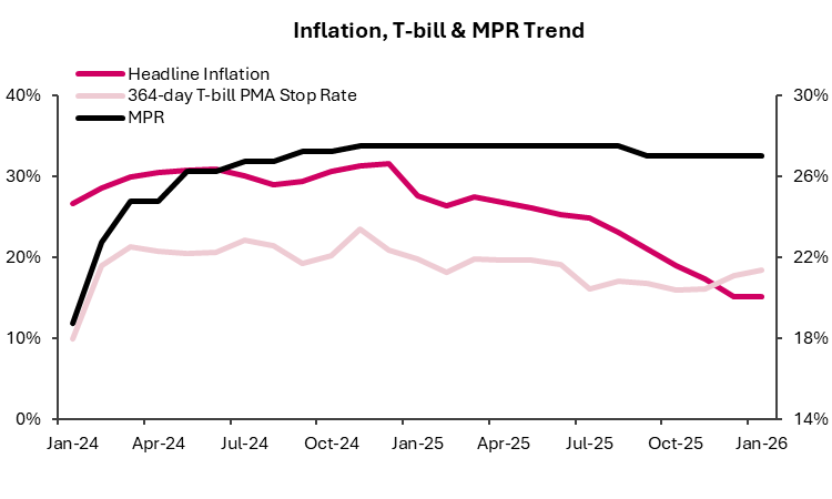 The rate decision also came on the back of the sizeable slowdown in headline inflation to 15.1% in January 2026 (as against the peak of 31.5% in December 2024) and a 27.5% y-o-y spike in gross foreign currency reserves to USD49.2bn as of 23 February 2026.